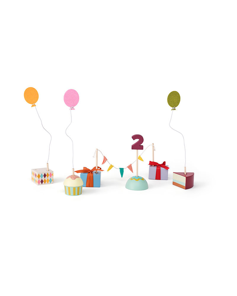 Denna bordsdekoration i trä för födelsedagar innehåller figurer som föreställer tårtor, cupcakes och små presenter. Varje figur har ett nummer för att markera födelsedagsbarnets ålder. Setet kommer med siffrorna 0 till 9 samt en extra siffra 1, vilket gör att det kan användas vid flera födelsedagar.