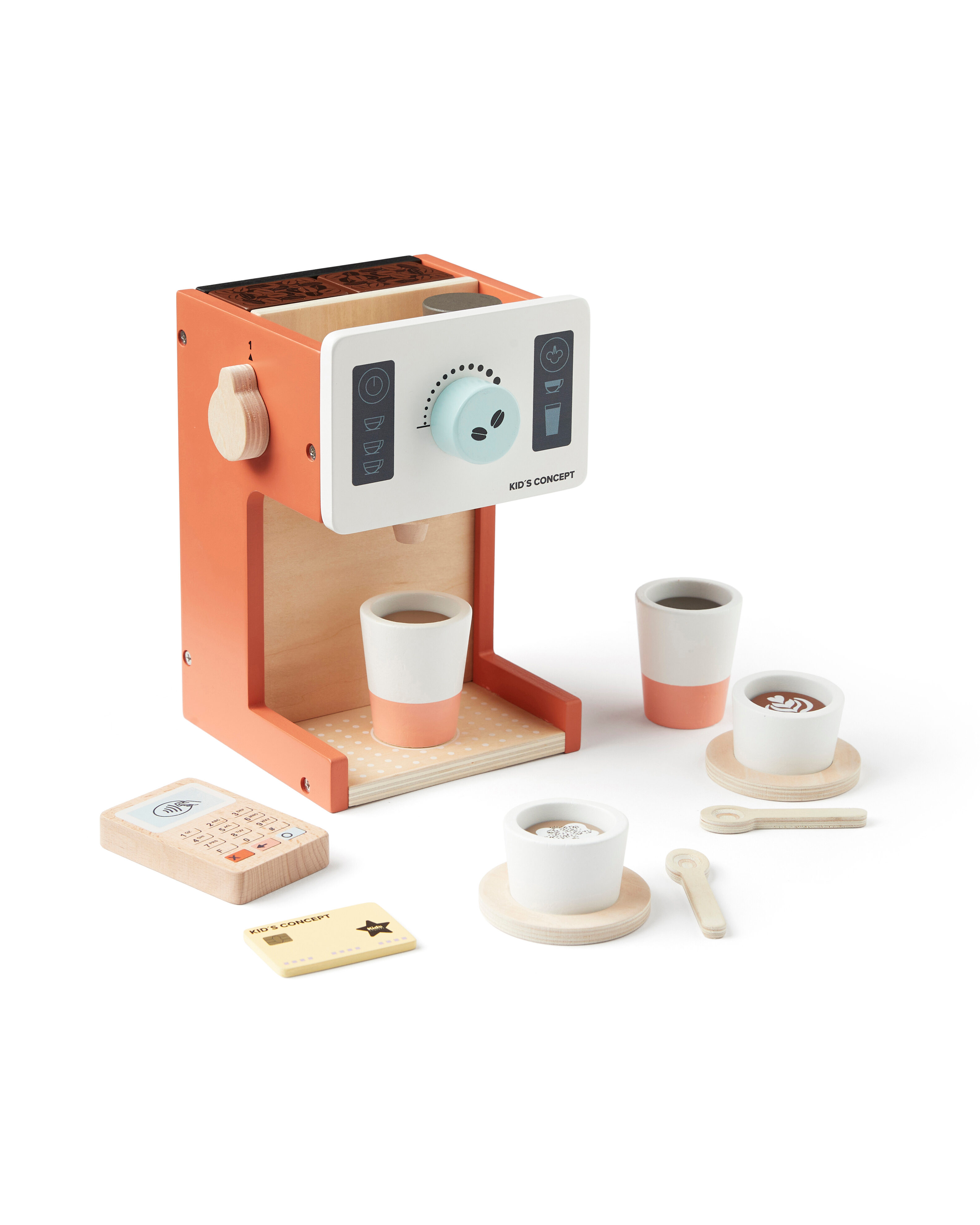 Kaffemaskin i KIDS HUB i FSC-certifierat trä. Nu kan du vara din egna minibarrista, öppna kafé och servera cappuccino, latte eller en americano. Valet är ditt! På kaffemaskinens sida finns en av/på knapp. På baksidan finns en griffeltavla där man kan sin skriva en meny. (krita medföljer ej). På framsidan finns ett vred med klickljud för att bestämma styrkan på kaffet och en tryckt display för mjölk skummare och olika väl för kaffet. På ovansidan av maskinen finns förvaringsfack för kaffet. I setet ingår två fat, två små koppar, två stora koppar, två teskedar, en kortläsare, ett Kids Concept betalkort (med obegränsad giltighetstid). Totalt är det 17 delar i setet. Blocken med kaffe passar både i stora och små koppar.