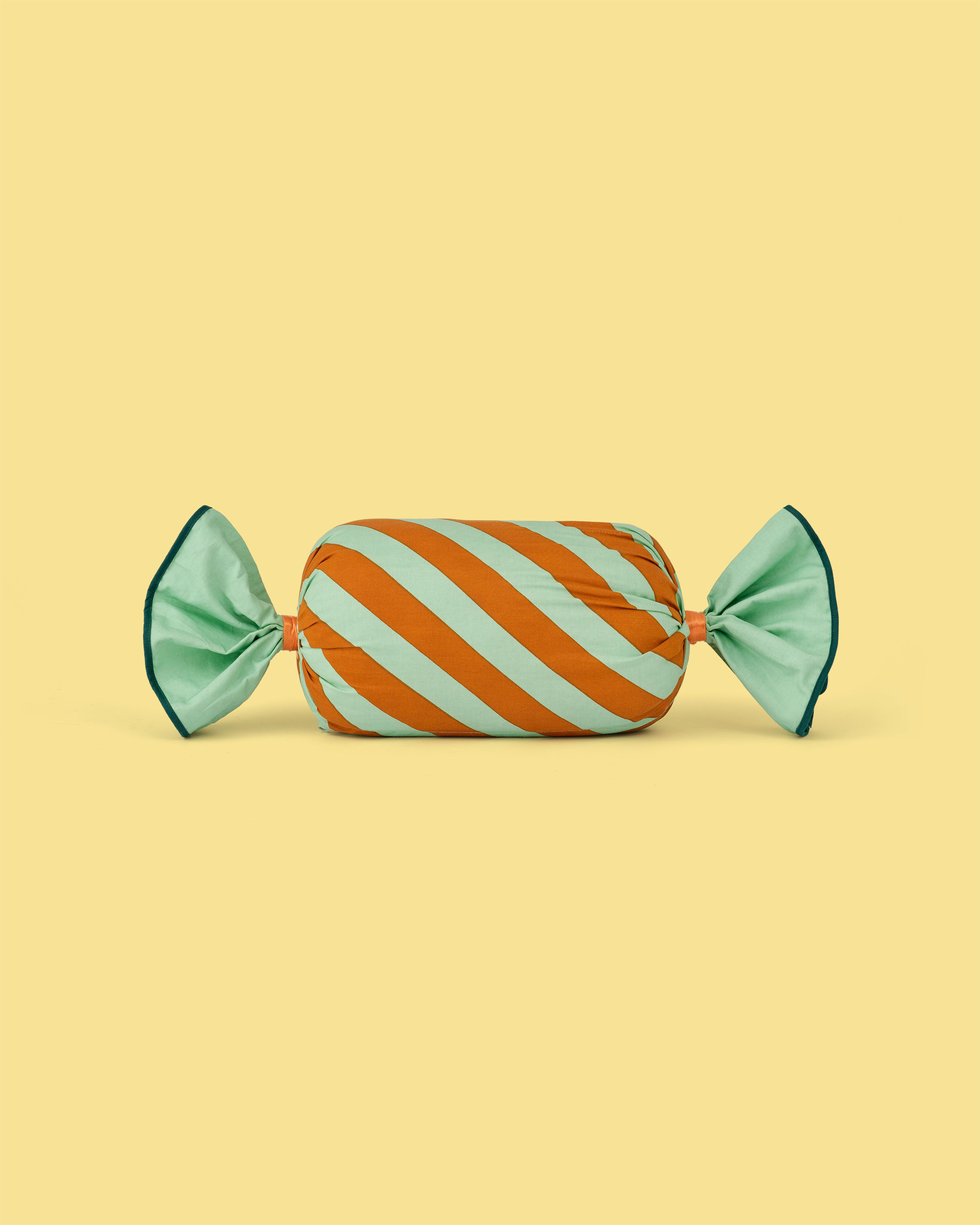 Den här kudden hämtar sin form från just de inslagna karamellerna – en mjuk, cylinderformad kudde med ändar som är fint knutna som ett inslaget godis. De grönaktiga och karamellfärgade ränderna påminner om en kola blandad med mintgodis. Kudden är Oeko-Tex-certifierad och har en diskret dragkedja för att enkelt kunna ta av och tvätta överdraget vid 30 grader. Mjuk och skön, fungerar den lika bra som en kudde att vila huvudet på som en fin färgklick som livar upp rummet – ingen vagn behövs.