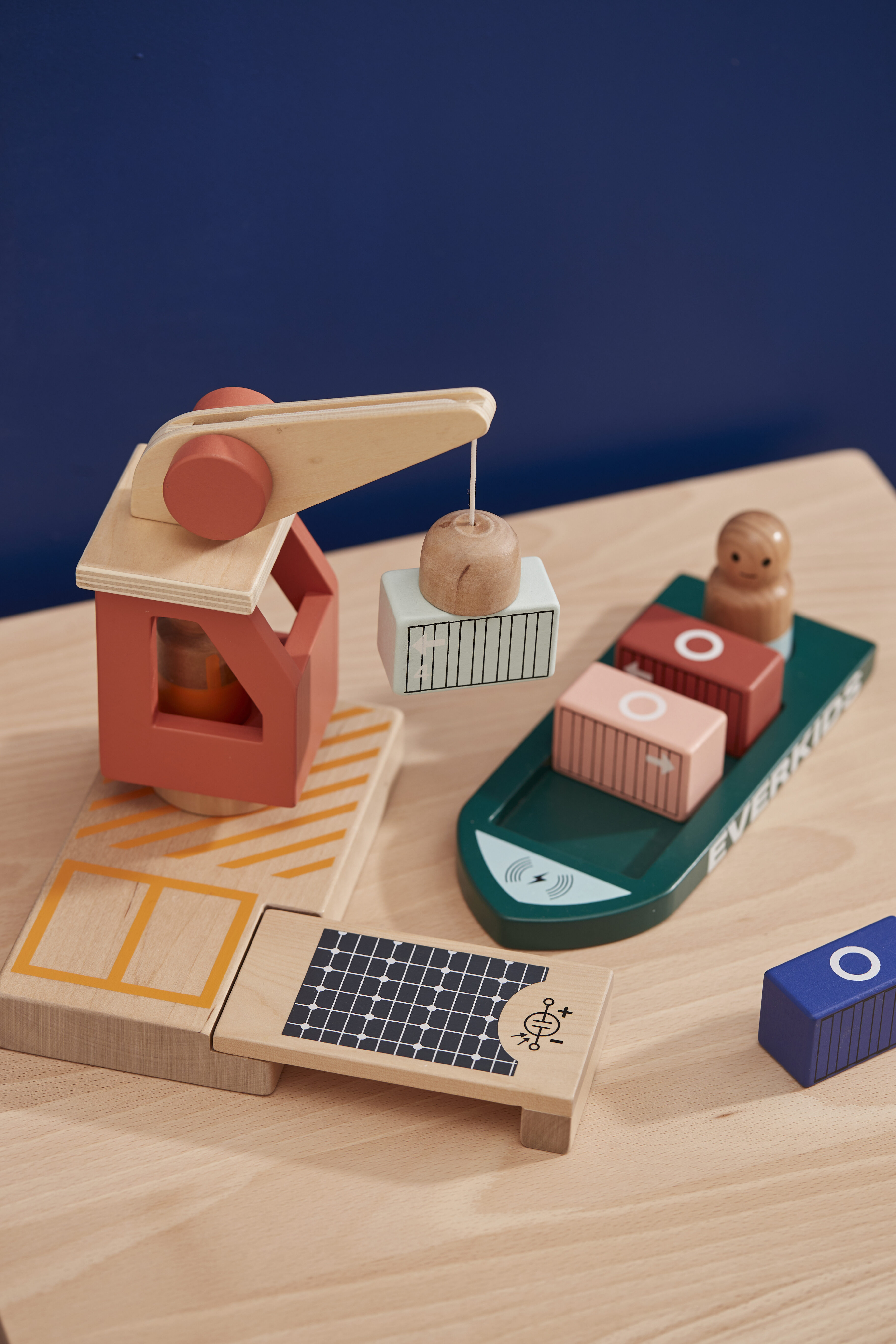 Containerhamn AIDEN i FSC-certifierat trä. I setet ingår containerfartyg, hamnområdet med två kajer, lyftkranen med "krok" av magnet som är integrerad inuti träet, fyra containrar med dolda magneter inuti och två träfigurer, Svea som är kapten och Bernie som är hamnarbetare. Lyftkranen kan snurras 360 grader och kranen med "kroken" kan vevas upp och ner med knappen som klickar på sidan. Med fartyget, som är världens första fossilfria containerfartyg, kan de nu frakta leksaker och andra barnartiklar över hela världen utan utsläpp, laddad med solenergi. Uppmuntrar till roll spel och stimulerar fantasin där allt är möjligt.