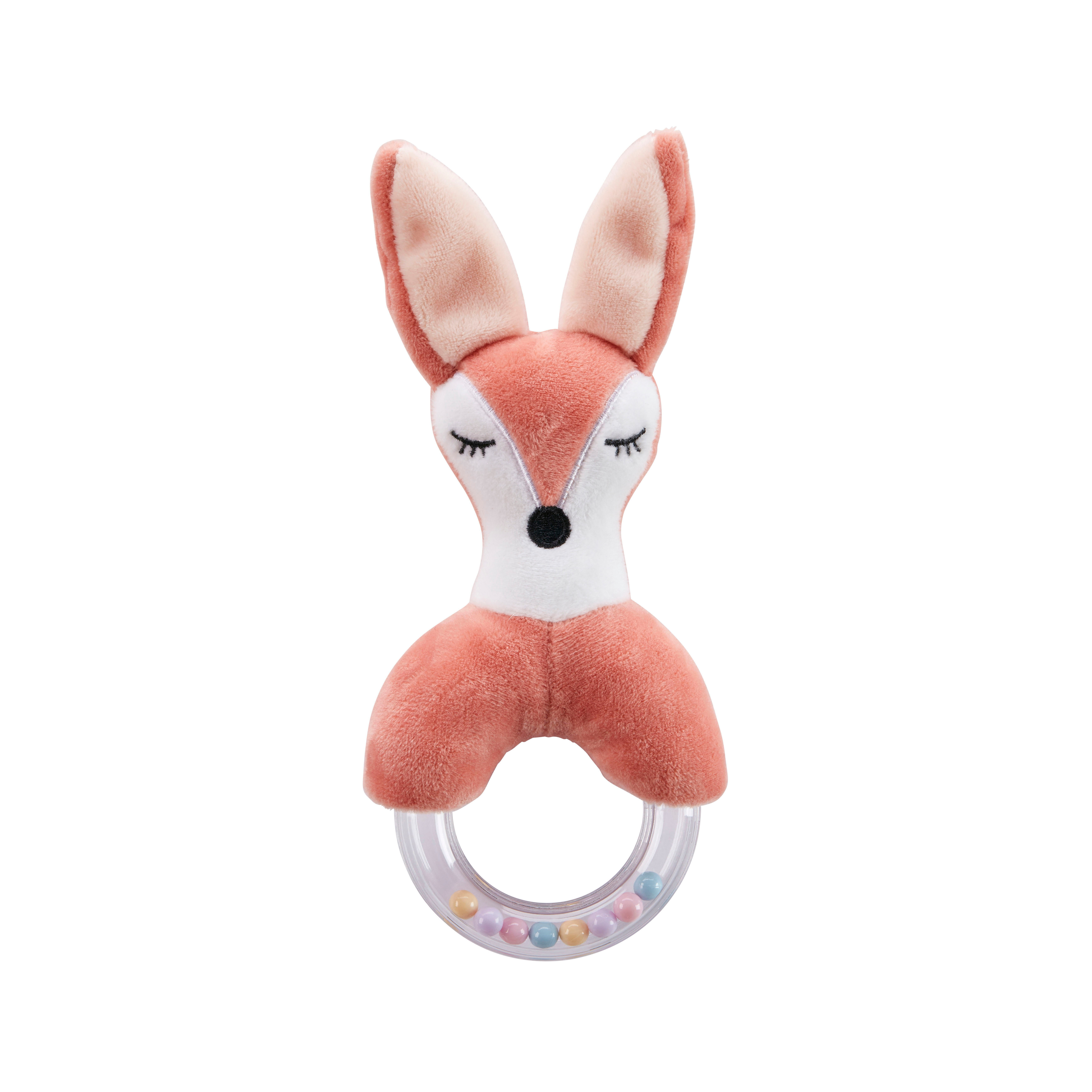 Söt ringskallra i form av en räv ur EDVIN konceptet. Räven är mjuk och skön att hålla i och nedre delen av skallran är gjord i genomskinnlig plast med färgglada kulor på insidan. Skallran är greppvänlig och passar för de allra minsta.