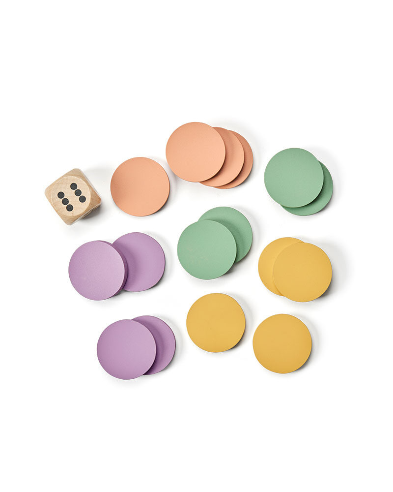 Spelpjäs set med stora spelpjäser och tärning i trä. Passar till vår stora lekmatta fiaspel, art.nr 1000727.