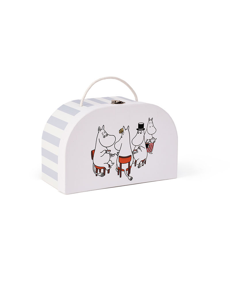 Vad packar du i väskan nästa gång? Den här väskan i stadig papp, med motiv av Muminfamiljen, passar fint för kaffesetet, en liten picknick eller skatter som ska med på utflykt. För alla små resor – riktiga eller påhittade – i Mumindalens anda